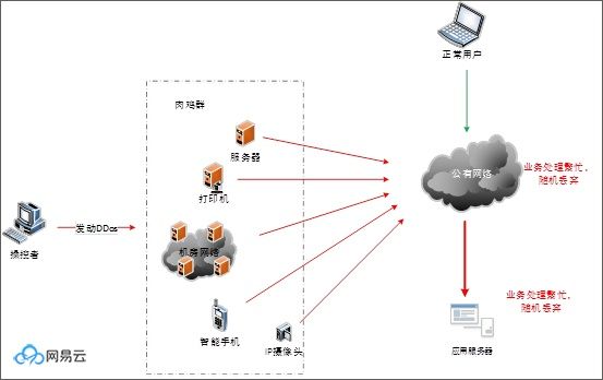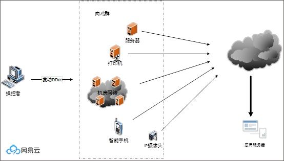 DDoS全称Distributed Denial of Service,中文意思为“分布式拒绝服务”,就是利用大量合法的分布式服务器对目标发送请求,从而导致正常合法用户无法获得服务。通俗点讲就是利用网络节点资源如:IDC服务器、个人PC、手机、智能设备、打印机、摄像头等对目标发起大量攻击请求,从而导致服务器拥塞而无法对外提供正常服务,只能宣布game over,详细描述如下图所示:
