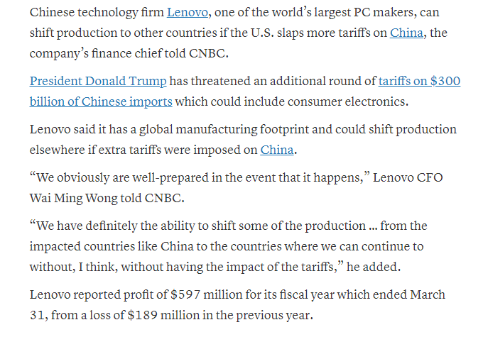 据美国哥伦比亚广播公司5月24日报道,联想CFO24日对CNBC表示,如果美国对中国征收更多关税,全球最大的个人电脑制造商之一、中国科技公司联想可以将生产线转移到其他国家。
