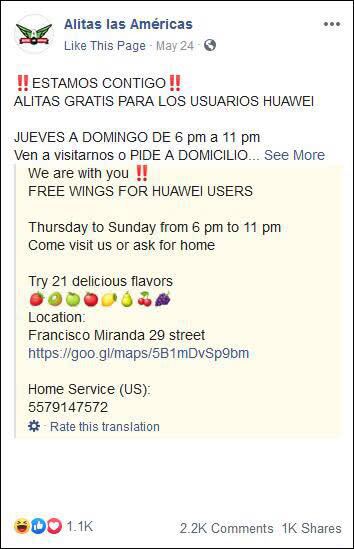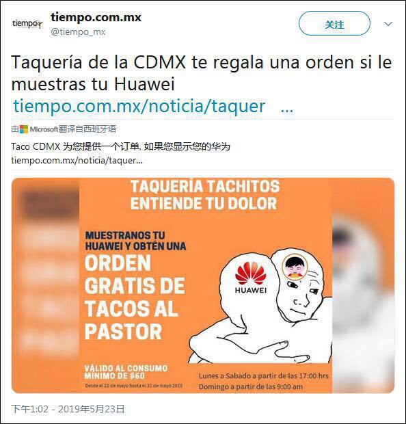 表示支持的还有墨西哥的一家炸鸡餐厅,这家餐厅社交媒体上表示,理解你的痛苦,免费赠送鸡翅,只要使用华为设备,购买双人套餐就可以免费获赠鸡翅。