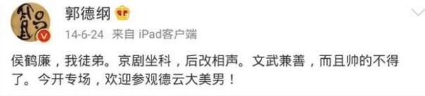 德云社风波又起,侯鹤廉退出德云社,前两天德云社演员怼观众,当红艺人秦霄贤和搭档孙九香在小剧场演出时因为观众不满而与之展开了口舌之争得罪了“衣食父母”,遭到了媒体以及网友们的口诛笔伐,德云社为了息事宁人不得不宣布让两人暂时停演。而侯鹤廉退出德云社实在让人大呼意外。