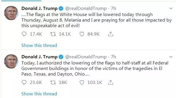 今天,为了纪念得克萨斯州埃尔帕索和俄亥俄州代顿市所发生的悲剧的受害者,我授权将所有联邦政府大楼的旗帜降半旗。白宫的旗帜将从今天到8月8日星期四都降半旗。我的妻子梅拉尼娅和我正在为所有受到这种无法形容的邪恶行为影响的人祈祷!