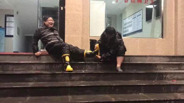 一位宁波民警,在救助群众回程中,徒步通过涉水路段,湿透全身,坐躺在雨檐的台阶下。因为长时间浸水,雨靴一时脱不下来。