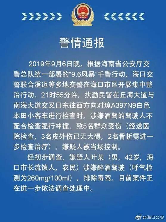 经初步调查,嫌疑人叶某(男,42岁,海口市长流镇人,农民)涉嫌醉酒驾驶(呼气检测为260mg/100ml),排除毒驾。目前案件正在进一步依法调查处理中。