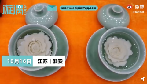 10月16日,江苏淮安第三届食博会现场,高三男生张梦义用豆腐雕刻牡丹花,吸引了众人围观。一块豆腐进入水中,张梦义拿起手中的雕刻刀,大概三分多钟,一朵惟妙惟肖的牡丹花就完成了,围观的人一致觉得不可思议,直呼妙不可言。