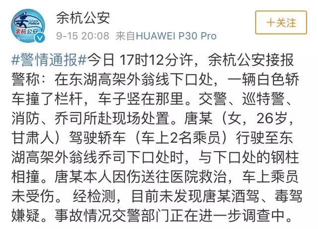 9月15日,浙江杭州东湖高架外翁线下口处,一辆白色轿车撞上指路牌的杆子,整个车身竖直靠在栏杆上,车头有撞击损坏痕迹,周边散落着路障。据后车行车记录仪,该轿车在靠近高架下口处变道后,快速冲向防撞水马,车身笔直地架在了标志杆上。15日晚余杭交警发布通报,26岁女司机唐某因伤送院,车上2名乘员未受伤。 经检测,目前未发现唐某酒驾、毒驾嫌疑,具体事故情况正在进一步调查中。