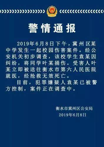 冀州区公安局发布的通报称,8日下午,冀州区某中学发生一起校园伤害案件。