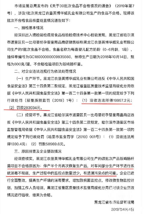 6月4日,黑龙江省市场监督管理局发布通告,对生产不合格奶粉的黑龙江农垦英博华威乳业有限公司(以下简称华威乳业)开出罚单:没收违法所得19.9万元、罚款29万元。今年3月7日,国家市场监督管理总局公布《关于30批次食品不合格情况的通告》,由华威乳业生产的每嘉婴儿配方奶粉“榜上有名”——奶粉中检验出有致死率极高的阪崎肠杆菌,事后该乳业公司被勒令停产至今。