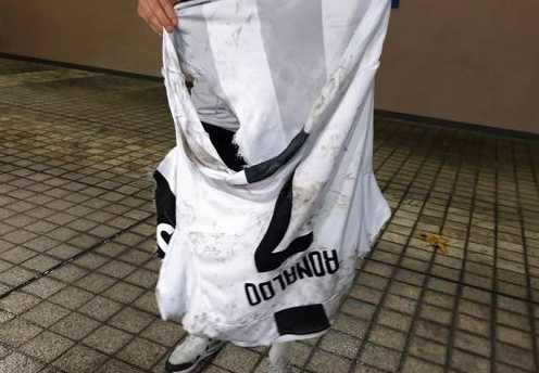 C罗跟随尤文赴韩国热身,虽然他想上场,但尤文主帅萨里还是按照先前球队约定,“勇敢”将其雪藏。这一做法使得韩国球迷十分愤怒,其中有一位球迷直接撕坏了C罗的球衣!而从球衣上的脏痕来看,这件尤文7号战袍必定还被扔到了地上进行疯狂踩踏…