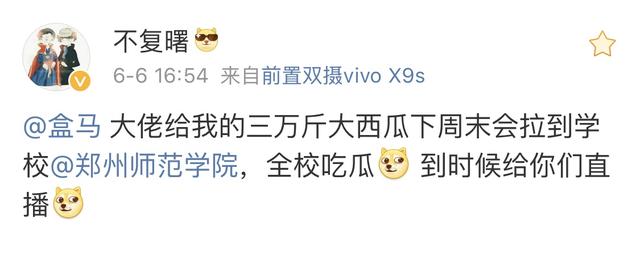 同时,小赵也通过自己的微博@不复曙发消息称,中奖的3万斤大西瓜,将于下周末拉到学校(郑州师范学院),“全校吃瓜,到时候给你们直播”。
