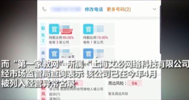 至于现在出了这种问题,要怎么去解决?客服说,这要看情况的,一般是提交给相关同事处理。而“第一家教网”所属的“上海艾必网络科技有限公司”,经市场监管局查询已经在今年四月被列入经营异常名单。但网站现在还在正常运作,这就很迷了…