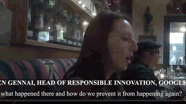 谷歌负责“Responsible Innovation”部门的主管Jen Gennai在餐厅闲聊的视频被人偷偷的拍下来,曝光了。很不幸的是,这个视频被放到了YouTube上,然后,然后就没有然后了。YouTube把这个视频给禁了。Jen Gennai就是下面这个主角。
