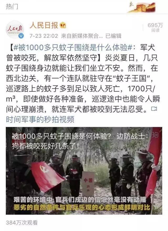 【被1000多只蚊子围绕是什么体验:军犬曾被咬死,解放军依然坚守】炎炎夏日,几只蚊子围绕身边就能让我们坐立不安。然而,在西北边关,有一个连队就驻守在“蚊子王国”,巡逻路上的蚊子多到足以致人死亡,1700只/m3,即使做好各种准备,巡逻途中也能令人瞬间心理崩溃,就连军犬都被咬到无法忍受。