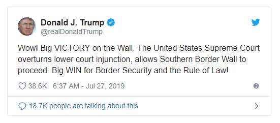 特朗普26日在推特上赞扬了最高法院的裁决,称这是“边境安全和法治”的胜利。