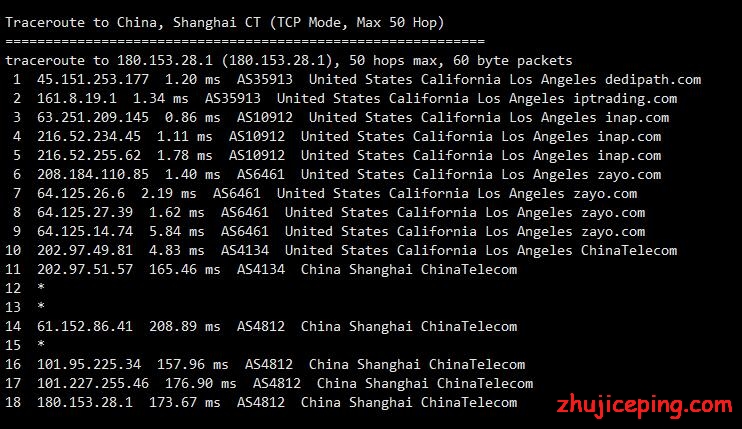 电信回程,到北京、上海、广州,走att、zayo、Comcast,这样看起来混合BGP算是调优过了:
